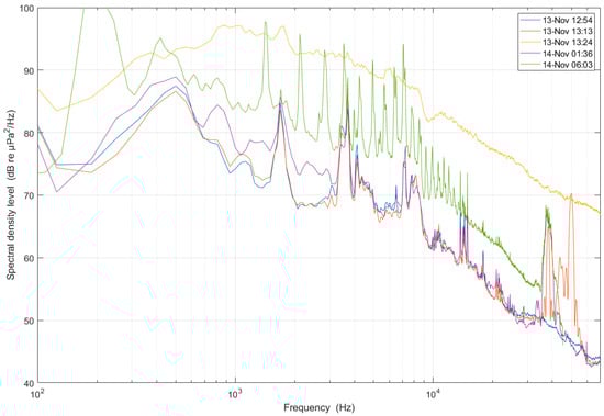 Figure 6 shows noise spectra measured in November 2023, obtained with a hydrophone suspended at a depth of 25 m from the fish cage platform. The spectra are averaged over 60 s of data, excluding modem transmissions and noise of passing boats. The blue, red, and purple spectra are essentially the same between 3 and 35 kHz. This is the noise background that is always present, and includes a number of sharp peaks (tonals). Between 35 and 55 kHz there are strong, intermittent sources of sound, which have been identified as echo sounders used by the CRIMAC project [10], a project led by the Institute of Marine Research, also performing work at the Austevoll facility.