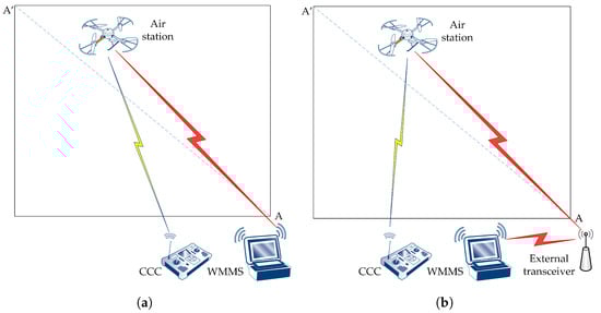 In scenario S1, the WMMS was placed at point A and the production network was built as an independent BSS (IBSS) (Figure 2a). In scenario S2, the WMMS was located approximately one meter away from point A, while the external transceiver was located at point A. Due to the presence of the external transceiver, the production network in scenario S2 consisted of two BSSs, and the external transceiver relayed the packets between the air station and the WMMS (Figure 2b).