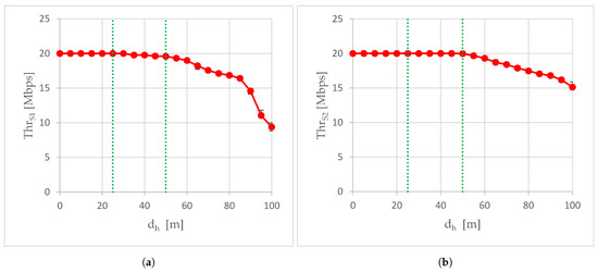 Total throughput calculated in scenarios: (a) scenario S1; (b) scenario S2. Green dotted lines mark the boundaries of the areas defined in Section 4.