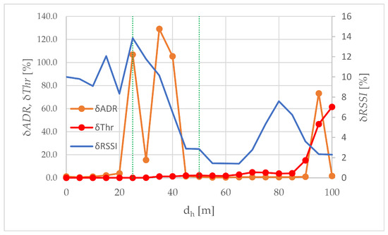 The increase in the occurred when the RSSI curve in scenario S1 fell much faster than the RSSI curve in scenario S2. Such an increase was the cause of two maxima, global and local, on the curve shown in Figure 4. The global maximum (9 dBm) occurred at equal to 25 m. In this case, the growth of the ended when the RSSI reading in the S1 scenario passed the −67 dBm limit ( equaled 30 m), as a result of which the RSSI entered a quasi-constant section of the RSSI characteristic. Since in scenario S2 the RSSI was still above the −67 dBm limit, on the descending section of the RSSI characteristics, a reduction in the occurred (up to 2 dBm for of 45 m). The other maximum, i.e., the local one, was caused by a sharp drop in the RSSI in scenario S1, while the RSSI in scenario S2 was still at the quasi-constant section of the curve. The increases up to 6 dBm at = 80 m, and then decreases when the RSSI in the S2 scenario fell well below the −70 dBm limit. The next, −80 dBm of the limit of basic connectivity (long dash line in Figure 3) was achieved at 85 m from point A in scenario S1, and at 90 m from this point in scenario S2. After exceeding this limit in scenario S2, the decreased to 2 dBm and remained at this level when the air station reached point A’.