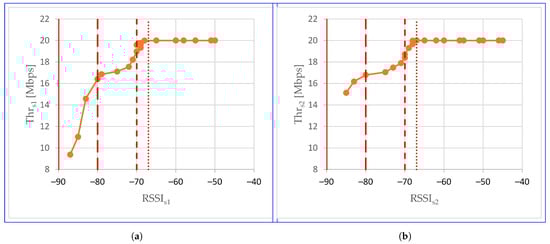 The available data rate remained at 26 Mbps for almost the rest of the A-A’ route. Only at the end of the A-A’ route (for of 95 m in the S1 scenario and of 100 m in the S2 scenario, i.e., in the place where the RSSI reached −85 dBm), did it drop to 15 Mbps. As a result, from equal to 45 m, the value of ranged from 80 kbps to 340 kbps. Only at the penultimate measurement point, for equal to 95 m, did a small increment (the second local minimum of the above 11 Mbps) occur, related to a longer stay on a quasi-constant section of the available bit rate curve in the S2 scenario.