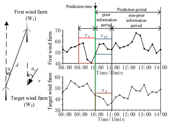 The T before the prediction time of the first wind farm is τ1, and the T after the prediction time of the target wind farm is τ2, as shown in Figure 1. Because the fluctuation of power in τ1 is related to τ2 and the power in τ1 is known, it can provide prior information for the fluctuation of power in τ2. The correlation between power in τ1 and τ2 is verified in Section 5.2.