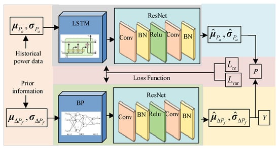 In Figure 2, after using the historical power data of the target wind farm and the prior information to obtain Pa and ΔPf, the respective mean and variance sequences are input into the corresponding neural network. The neural network is combined with ResNets in CNN. The structure of the ResNets is ‘Conv+ BN+ ReLU+ Conv+ BN’, and two output channels are set to output the mean and variance after approximation. By using Y, that is, the power of the change at the previous moment, the approximated power fluctuation sequences and are restored to the power sequence. It is weighted with the approximated power sequences and , and the power prediction result of the prior information period P considering the two influencing factors is obtained.