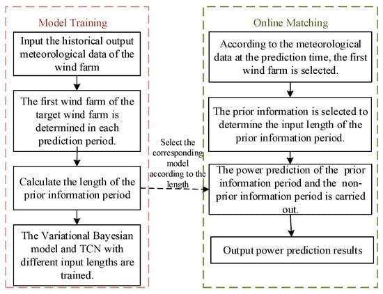 Since it is necessary to calculate the time difference between the wind farm fluctuation-related power at the prediction moment to determine the length of the prior information period and the input lengths of the models. To reduce the time consumption of each prediction and to meet the demand of ultra-short-term prediction for computing speed, we construct the variational Bayesian model and TCN model with different input lengths for the two time periods in the train set. The overall prediction process diagram is shown in Figure 3.