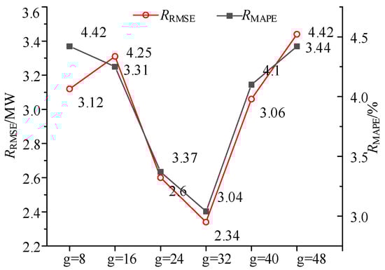 The optimization process of g is set to start from 8. In theory, a larger number of channels will increase the complexity and computational burden of the model, and also improve the learning ability of hidden information. However, it can be found from Figure 5 that when the number of channels increases to 32, RRMSE gradually decreases, and the error reaches the lowest value when g is 32. After further increasing g, the error increases. It can be found that g has a certain influence on the performance and effect of the neural network, but it is not a simple proportional relationship. If we do not consider the characteristics of the data, the needs of the task, and other factors, blindly increasing the number of convolution channels will increase the error.