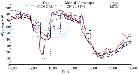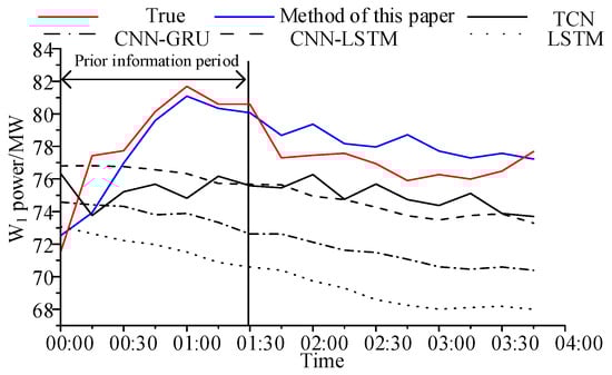 It can be seen from Figure 6 that in the prior information period, LSTM only learns the time series features and has the worst prediction effect. After adding the CNN kernel that captures spatial features, the prediction effects of CNN-LSTM and CNN-GRU improve. However, it is still impossible to learn the fluctuations in the wind farm. TCN with multiple convolutional layers can learn the characteristics of different time scales and better fit the fluctuations of wind farms. However, the spatial and temporal correlation between wind farms is time-varying, and it still cannot adapt to a sudden change in power. Our method is not only to learn the historical power of the target wind farm, but also to directly use the power fluctuations that have occurred in the first wind farm as prior information to predict the power of the target wind farm in the period with prior information, which can reflect the sudden change in power caused by the change in wind speed in time. Therefore, it can reflect the sudden change in power caused by wind speed change in time.