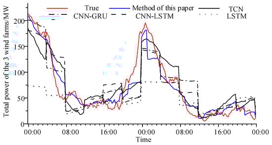 Comparison of the total power prediction curves of multiple wind farms under different methods.
