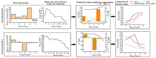According to Zhang et al., the interpretability of the improved variational Bayesian model can be reflected in three dimensions []: (1) According to the number of power points that need to be predicted in the prior information period, different models are established. Active interpretability is reflected by selecting different models at each prediction time. (2) After obtaining the prediction results Pa and ΔPf that only consider the influence of a single factor, the balance of Lce and Lvar is used to approximate the real distribution. The prediction result of the two influencing factors is comprehensively considered. The interpretability focuses on the overall decision logic of the model, reflecting the global interpretability. (3) The physical meaning of variables in the variational Bayesian model is clear, enhancing the comprehensibility and interpretability of the model. For example, ΔPf represents the prediction result of power fluctuations only considering the influence of prior information, and Pa represents the prediction result of power only considering the influence of historical power of the target wind farm.
