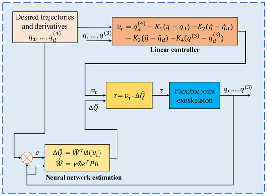 - A control scheme based on an ANN is proposed to estimate the external disturbances, the nonlinear exoskeleton model, and the human behavior. Furthermore, a feedback linearization controller is proposed to perform a smooth tracking trajectory to prevent injuries.