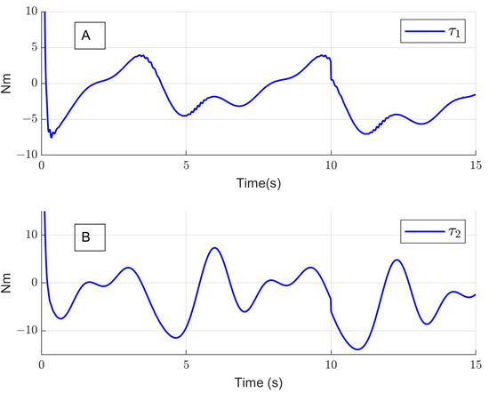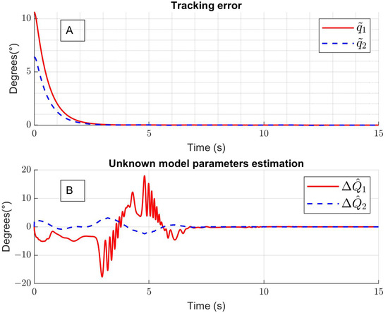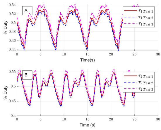 - In test B, the exoskeleton with a healthy user is tested to validate the robustness of the controller considering the user as an unknown uncertainty (https://youtu.be/r4ciHMjtOJo accessed on 20 September 2024.