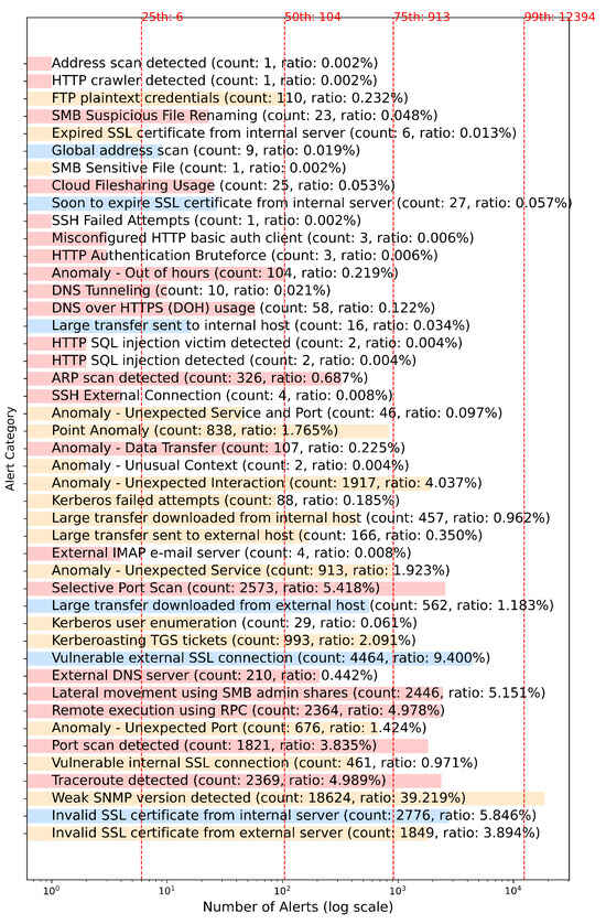 We found 46 unique alerts categories shown in Figure 1 with their frequencies. By looking at the percentiles, we can see that some alert categories are more frequent than the others. The most frequent in Figure 1 is Weak SNMP version detected, and it has been seen about 39% of the whole dataset, while there are three alert categories with the least number of alerts (0.002% each). It is obvious from Figure 1 that we could ignore categories with a low frequency of alerts, as one may assume that they will have less impact on security analysts’ feelings of alert fatigue. The figure shows different percentiles, and the proposed method in this paper could be used on alerts of categories meeting a percentile value.