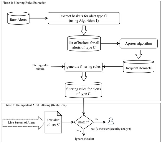 Market basket analysis has been effectively used in many cases from retail sales optimization to healthcare diagnostics [17], identifying frequent co-occurrences of products or symptoms to enhance decision-making and strategic planning. We believe that using market basket analysis techniques could also be useful in finding repetitive security alerts. Therefore, nothing prevents us from creating one shopping basket per security alert and applying frequent itemset detection algorithms to find the repetitive alerts that could be good candidates for reducing alert fatigue. Figure 2 describes the procedure to extract filtering rules for each alert type using a block diagram, where Phase 1 extracts filtering rules for each alert type C using Algorithm 1, and Phase 2 applies the extracted rules to a stream of raw alerts to avoid notifying users when facing unimportant repetitive alerts.
