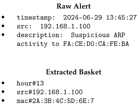 A basket is a an unordered list of items being seen together in an alert, so an alert could be converted to a basket based on the values of its fields. The extracted basket represents the structured attributes derived from the main alerts. Each attribute in the extracted basket corresponds to a specific feature extracted from the main alerts. This structured representation facilitates the further processing and analysis of security events. Figure 3 shows an example of an NDR alert mapped to a market basket. Note that ARP scan detected alerts do not have a destination IP address included in the main alert. If the destination exists in the main alert, the extracted basket includes an item dest#IP_ADDRESS. We call items extracted directly from the data fields of a raw alert fundamental alerts, while any items extracted from the description field of a raw alert would be called extended items. In the given example, the timestamp 2024-06-29 13:45:27 from the raw alert has been used to add a fundamental item to the basket showing the time of the day of the alert (in this alert, it is 13), while extracting the MAC address from the description field of an alert makes an extended item in our alert basket. It is obvious that the structure of baskets could be defined based on a decision made by the user as they want to have filtering rules. For example, a user may want to add the day of the week as an item to their baskets, which would be day_of_week#Monday for the given timestamp.