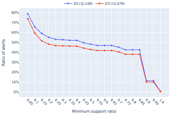 Figure 4 shows how many alerts could be considered potential noise for the datasets and from Table 1. Essentially, it is about finding the repetitive alerts that can be safely ignored to reduce the burden on security analysts. The graph plots the minimum support ratio on the x-axis against the percentage of alerts classified as potential noise/unimportant alerts on the y-axis. For instance, when the minimum support ratio is set to , about of the alerts are identified as potentially unimportant. This means that if an alert appears frequently enough (in this case, at least of the time), it is likely to be unimportant and, potentially, it is noise. Adjusting the minimum support ratio is crucial because it determines the threshold at which alerts are considered repetitive. Our security analyst suggests a threshold of 0.7, meaning that an alert must appear at least 70% of the time to be flagged as noise. This significantly reduces the number of alerts considered unimportant, allowing analysts to focus on more critical issues.