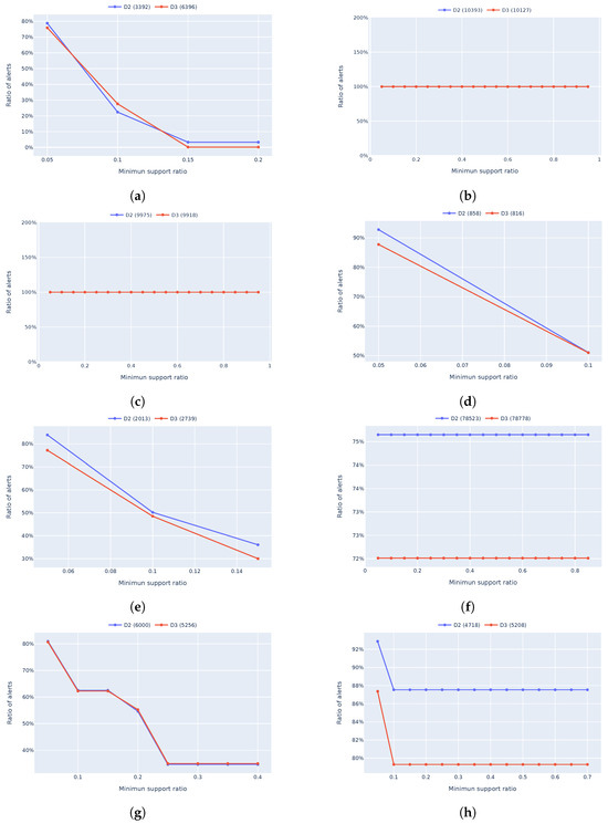 The plots in Figure 5 show that by increasing the minimum support, we flag less alerts as unimportant, and this is because we will have less frequent itemsets once we increase the required minimum support. For a few alert types, we can see a alert reduction and, after checking the datasets and the itemsets, we noted that all alerts of that type are raised for a particular IP address, and the same IP address is being seen in all frequent itemsets leading to a cut in the number of alerts (see Figure 5c as an example). We also investigated the reason for straight lines in the plots of some alert types (e.g., Weak SNMP version detection), and we noticed that the main cause is the high frequency (support) of the alerts with that type. In this case, we observed that the majority of alerts (approximately 70–75%) share common values (such as IP addresses). As a result, we identified the same frequent itemsets across all examined minimum support ratios (0.05 to 0.95), leading to consistent filtering rules and the same noise reduction ratio.