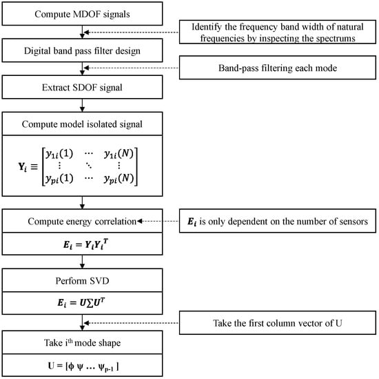 The TDD technique is performed according to the procedure shown in Figure 1. First, using digital band-pass filters, the ambient vibration accelerations measured by accelerometers are processed to calculate the time response data matrix that contains only the frequency components expected to include the natural frequency. If time samples are measured using accelerometers, the size of is times. Second, the energy correlation matrix is defined as shown in Equation (1).