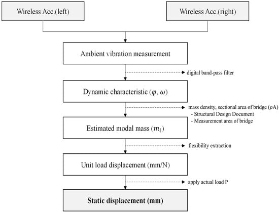 The proposed method for estimating bridge displacement using ambient vibration is summarized in the flowchart shown in Figure 2. Wireless accelerometers are installed at equal intervals on both sides of the bridge to measure ambient vibrations. The reason for installing them on both sides is to exclude torsional modes in the vertical direction of the bridge and extract only the bending modes through a modal shape analysis. Using the measured ambient vibrations, the modal shapes and natural frequencies are calculated based on the TDD technique. The flexibility curve is then derived by calculating the mass per unit length of the bridge through as-built documents or structural analysis. The extracted flexibility curve can be considered as the displacement caused by a force of 1 N, and by applying the actual load, the static displacement of the bridge can be estimated. This method can be applied as an effective maintenance system for bridges where it is difficult to perform vehicle load testing, as well as for railway bridges where constant vibrations occur repeatedly, as it allows for the prediction of displacement based on stiffness without the need to apply actual loads to the bridge.