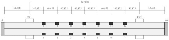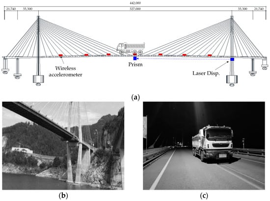 To verify the field applicability of the proposed method, a demonstration test was conducted on an in-service bridge. As shown in Figure 3a, the test bridge is a two-tower cable-stayed bridge with a total span of 442.0 m and a width of 13.0 m, completed in September 2010. Figure 3b shows the superstructure and substructure views of the bridge. Because there is a lake beneath the bridge, it is not possible to apply the conventional method of installing LVDTs on the substructure to measure displacement. To measure the displacement at the midspan, where the maximum displacement occurs, accelerometers were installed in the main span (327.0 m), and ambient vibration monitoring and loading tests were conducted. As shown in Figure 3a and Figure 4, the wireless accelerometers were installed at 7 points on both sides of the bridge at equal intervals of 40.875 m, resulting in a total of 14 points for ambient vibration measurements. The ambient vibration measurements were conducted during the daytime, when there was heavy traffic, to ensure sufficient data collection. The measurements were taken for approximately 1 h and 30 min at a sampling frequency of 128 Hz, focusing on the vertical acceleration component. The data obtained from the ambient vibration measurements included not only the dynamic behavior of the bridge but also environmental noise (such as wind, vehicles, and external vibrations). However, by collecting data over an extended period, such noise can be averaged or canceled out, allowing for a clearer extraction of the bridge’s inherent dynamic characteristics.