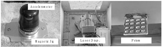 Meanwhile, to measure the actual displacement of the bridge, a load test was conducted using a dump truck with a total weight of 270 kN, fully loaded with soil. After completely restricting traffic, the truck was positioned at the center of the bridge for a static load test to apply the maximum load, as shown in Figure 3a,c. The test followed the guidelines in the Load Test Manual for the Safety and Maintenance of Bridges in Korea, positioning the rear wheel center of the vehicle at the location of the bridge’s maximum moment. The displacement values obtained from the static load test were measured using the laser displacement sensor (PSM-R) of the bridge’s maintenance monitoring system. The PSM-R is a long-distance displacement measurement sensor capable of measuring up to 400 m, and it monitors the vertical displacement of the bridge 24 h a day with a sampling rate of 20 samples per second. The detailed specifications of the laser displacement sensor used in the test are shown in Table 2. The laser displacement sensor was installed at PY2, with the prism target located at the midpoint of the bridge. The wireless accelerometers, a laser displacement sensor, and a prism target installed on the test bridge are as shown in Figure 5.