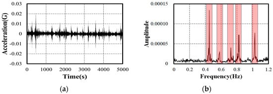 Inspection of the measured signal: (a) acceleration time response from sensor 4; (b) FFT result.