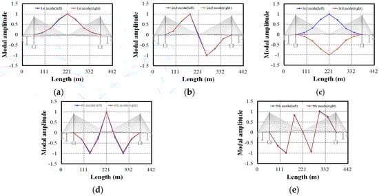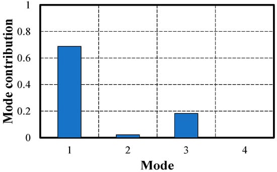 The modal mass was calculated using the unit mass of the bridge, mode shapes, and Equation (11), as shown in Table 5. The mode contribution at position for the mode can be calculated using the calculated modal mass of the mode, the value of position for the mode, and the natural frequency of the mode.