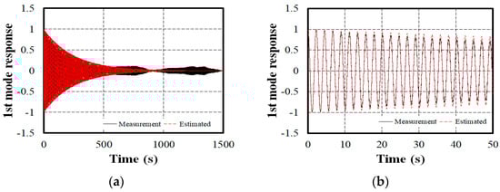 where is the amplitude, is the undamped natural frequency, is the damping ratio, is the damped natural frequency (), and is the phase angle. The parameters to be identified in Equation (4) are the natural frequency, damping ratio, amplitude, and phase angle. The natural frequency of the mode can be extracted by applying the sensitivity-based system identification (SI) method as an extension of the time domain decomposition (TDD) technique []. The SI method, a type of inverse analysis, optimizes the variables until the rate of change of the identified variables becomes zero by iterating until the measured and simulated values are equal. Thus, the SI method inevitably involves a repetitive process, requiring extensive calculations, making it challenging to implement automated programs.