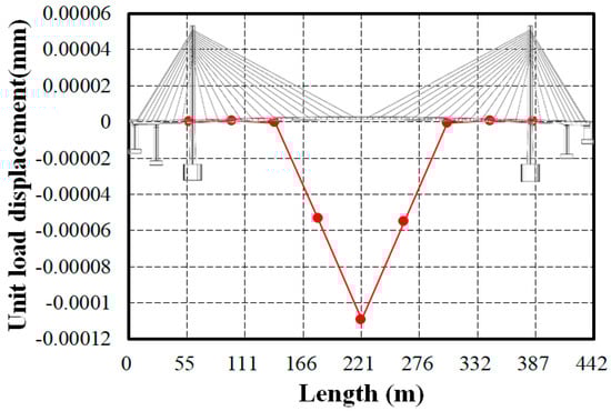 The displacement curve when a unit load (1N) is applied at the midspan of the bridge is shown in Figure 10. The estimated displacement at this point is −1.09 × 10−4 mm. The overall shape of the displacement curve indicates that the maximum displacement occurs at the center of the bridge, with almost no displacement near the pylons. This tendency is also observed in the first mode shape, which had the most dominant influence, likely due to the high tension maintained in the short length stay cables near the pylons. However, detailed investigations into the causes and relationships will require further research into the relationship between cable tension and displacement.