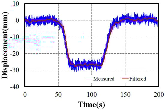 Assuming a linear load–displacement relationship for the bridge, the static displacement can be estimated by applying an arbitrary load P to the unit load displacement curve analysis results. The unit load displacement at the midspan, where the maximum displacement occurs, was −1.09 × 10−4 mm. When applying the load of 270 kN from the load test dump truck, a displacement of −29.49 mm was estimated. Meanwhile, the laser displacement sensor measurements from the static load test, shown in Figure 11, include noise and disturbances. This indicates that the measurement contains dynamic components due to the bridge’s inherent vibrations and the inherent noise of the laser displacement sensor, implying some inherent error. This noise was reduced by using a third-order Butterworth low-pass filter with a cutoff frequency of 0.2 to remove high-frequency components and emphasize low-frequency components. The filtered signal indicates a displacement of approximately −28.47 mm for the applied load of 270 kN.