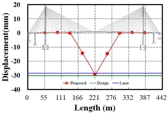 The estimated static displacement using the proposed method, the actual displacement measured by the laser displacement sensor, and the displacement from the structural analysis are compared in Figure 12. The structural analysis displacement is the theoretical value from the design at the time of completion, used to assess the bridge’s safety by determining whether the measured displacement exceeds the design theoretical value. The estimated displacement from the proposed method is −29.49 mm, the actual measured displacement by the laser displacement sensor is −28.47 mm, and the analytical value is −30.21 mm. Because these values do not exceed the theoretical value, it indicates that the bridge’s stiffness and displacement behavior remain stable compared with the time of completion. This is consistent with the results obtained from the stiffness comparison using natural frequencies. The difference between the estimated displacement and the measured displacement is 1.02 mm, showing an error rate of approximately 3.58%. Increasing the number of wireless accelerometers to enhance the resolution of the mode shapes may reduce the error rate, but considering the minimal contribution of modes beyond the fourth mode and the practicality and cost-effectiveness of fieldwork, the current level of displacement accuracy is deemed adequate.