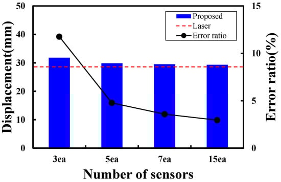 The number of continuous vibration measurement points is the most critical factor influencing the accuracy of mode shape extraction, which forms the basis of the proposed method. Increasing the number of continuous vibration measurement points can contribute to higher resolution mode shape extraction and thus greater accuracy in displacement analysis. However, considering test costs and work efficiency, this study aimed to analyze the optimal number of sensors that would be advantageous for practical applications.