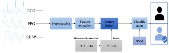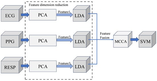 The existing literature shows that some multi-modal biomedical signal feature identification is based on single signals such as ECG, PPG, and EEG [,]. Still, single-modal biometric identification is vulnerable to attacks such as theft and impersonation. Some are based on multi-modal signals, such as ECG and PPG bimodal feature identification and biomedical signals combined with other biometric identification (such as fingerprints, faces, and finger veins) [,]. Compared with the other literature, in view of the difficulty and integration advantages of wearable devices to collect physiological signals, the technology can be combined with wearable devices (such as smartwatches and smart bracelets) in the future on the basis of the existing ECG and PPG signal dual-mode recognition, the first time to introduce respiratory signal (RESP) as a third biomedical signal for multi-mode signal recognition. And in terms of data sets, three kinds of biomedical signals from wearable devices were collected through the laboratory’s Pclab-801 embedded biomedical electronic laboratory box. We performed experiments on both public and self-collected datasets, demonstrating the effectiveness of this approach for biometric authentication compared to most previous work on recognizing these biomedical signals. The whole process is divided into four essential stages: signal preprocessing, feature extraction, dimensionality reduction fusion, and identity recognition. Firstly, the biomedical signals are preprocessed to extract the features. Aiming at the dimensionality disaster caused by multi-modal biomedical signal fusion, PCA and LDA feature dimensionality reduction are performed to improve the accuracy of three signal feature matrices. The best fusion feature matrix is obtained by MCCA three-mode fusion. Finally, a support vector machine is used for identification, as shown in Figure 1.