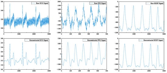 The MIMIC database [] used in this paper is a publicly accessible multi-parameter critical care database provided by the Computational Physiology Laboratory of Massachusetts Institute of Technology. Biomedical data such as ECG, Pleth, arterial blood pressure (ABP), RESP, and oxygen saturation (SpO2) were collected from the ICU for more than 69 patients. The data in each case included signals and periodic measurements from bedside monitors and clinical data from patient records, almost all of which were at least 20 h long, and many were 40 h or more. The database contains real-time signals and related data for nearly 200 patient days. In verifying and screening individual data in the MIMIC database, the following data screening criteria are applied: First, data integrity and consistency; each individual’s data in the MIMIC database do not contain a record of three medical signals—ECG, PPG, and RESP. Screening can ensure that each individual’s data includes the necessary medical signals to ensure the integrity and consistency of the data. Second, data quality; where there is continuous signal loss and interruption in the record, screening can eliminate individual data with excessive data loss or poor-quality data. After standard screening, ECG, PPG, and RESP signal data of 25 patients were finally selected to form the experimental data set. This data source comes from PhysioNet [].