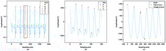 Additionally, it can calculate the minimum position between peaks and troughs to divide complete single-period PPG signals that encompass P waves, V waves, and starting and ending points. The RESP signal contains a single peak point, which can be identified where its derivative is zero or near zero if not precisely zero. Derivative methods are employed to locate both peaks and troughs within a RESP signal waveform segment. After segmenting a single periodic signal waveform, individual waveform complexes representing ECG, PPG, and RESP were generated, respectively. Figure 7 illustrates these results.
