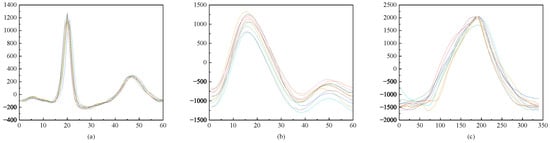 The reference point feature extraction of biomedical signal waveform segmentation after pretreatment is illustrated in Figure 6. Reference point segmentation refers to the method used for dividing the heartbeat []. To perform waveform segmentation of ECG signals, it is necessary to detect the R-peak. To achieve this objective, various algorithms have been developed, and our method employs the well-established Pan–Tompkins algorithm [].