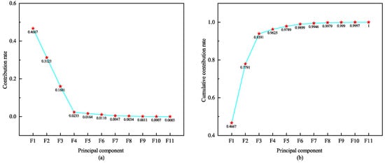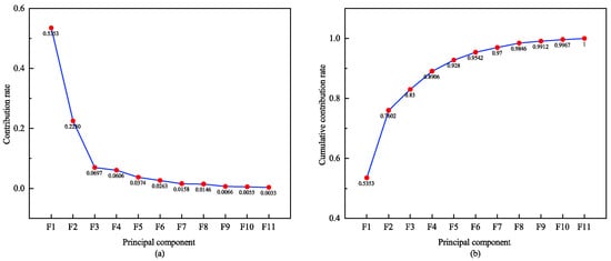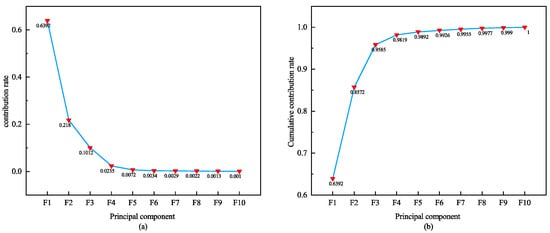 Principal component contribution rate and cumulative contribution rate of RESP. (a) shows the contribution rates of the first ten feature principal components for PCA reduction of RESP, and (b) shows the cumulative contribution rates of the first ten feature principal components.