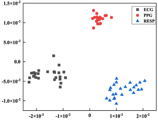 We add RESP signals into the dimensionality reduction fusion and use three kinds of signals to carry out a more in-depth third kind of multi-mode fusion experiment. Similarly, experiments were carried out on the MIMIC data set and a self-collected data set of the Pclab-801 embedded biomedical electronic experiment box, respectively, and three signals of 25 individual data were fused and identified. Consistent with the above feature extraction, dimensionality reduction processing, and sample set composition methods, on the basis of the initial dimensionality reduction of the three physiological signals by PCA, we further reduced the dimensionality of the three signals to six dimensions by using LDA to create a smaller dimensionality reduction fusion sample dataset. LDA performs lower dimension reduction and can also distinguish the categories of the three signals well, as shown in Figure 12.