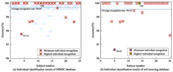 We show the individual recognition authentication results of MIMIC data sets and self-collected data sets, as shown in Figure 13. The lowest individual recognition accuracy was 97.75% in the mimic data set and 96.63% in the self-collected data set. More than half of the recognition rates reached 100%. From the perspective of physiological signal data, the lower accuracy rate of individual physiological signal identification than the average recognition rate may be caused by the following factors: First, individual differences. There are natural differences in the physiological characteristics of different individuals, which increases the difficulty of feature extraction and makes it difficult for the model to capture their unique features, which affects the accuracy effectively. Second, signal volatility and instability. Emotion, fatigue state, environment, and other factors will lead to large fluctuations in the signal collection process, increasing the difficulty of identification. Third, noise interference. Physiological signals (such as breathing, etc.) are susceptible to external interference, artifacts caused by the movement of the subject, or physiological noise, which will reduce the quality of the signal, thus affecting recognition accuracy. The process of physiological signal acquisition and recognition itself has a specific correlation, and these factors are inevitable. Through this individual-level identification test, we can further ensure the reliability of the method in practical applications.