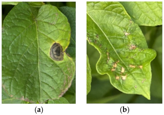 The experimental samples were leaves of potatoes grown in field environments in Wuchuan County, Hohhot City, Inner Mongolia Autonomous Region and Chahar Right-Wing Qian Banner, Ulanqab City, including 48 healthy leaves, 48 early blight leaves and 48 ladybug beetle-infested leaves. The collections were performed on 31 July and 6 August 2023, when the potatoes in the experimental area were in the flowering stage. All plants were infected with early blight and ladybugs in the natural state. The leaves are shown in Figure 1; Figure 1a shows the potato leaves infected with early blight, and Figure 1b shows the potato leaves infected by ladybugs.