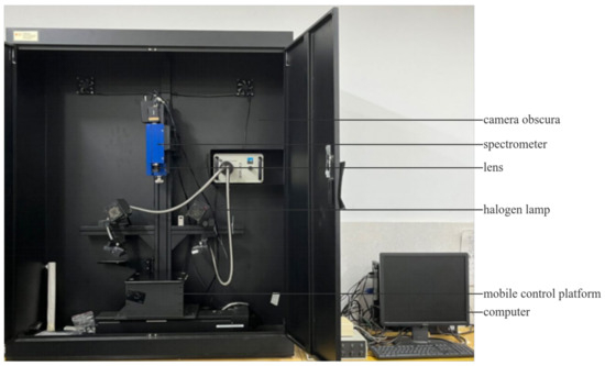 The experiment using a ISUZU OPTICS HSI system (Zhubei City, Taiwan) yielded spectral information in the 382.2358~1004.7804 nm range with a band number of 428 and a spectral resolution of 2.8 nm. As shown in Figure 2, the experiment was carried out in a black box, and the system included a hyperspectral image spectrometer (Spectral Imaging Ltd., Oulu, Finland), a CCD camera (Imperx, Boca Raton, FL, USA), two halogen lamps (150 W) (Illumination Technologies, Atlanta, GA, USA), a DC adjustable light source (Illumination Technologies, Atlanta, GA, USA), a mobile control platform (ISUZU OPTICS, Taiwan, China), a computer, etc. Before the experiment, black-and-white correction was performed to eliminate the influence of the background, dark current and light inequality on the reflectivity. The calculation formula is as follows: