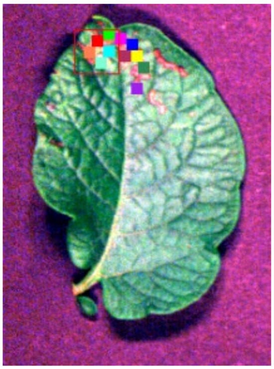 The hyperspectral images of the leaves were opened using ENVI 5.6, and a 10 × 10 pixel area was manually selected as the region of interest (ROI). As shown in Figure 3, each colored rectangular block represents an ROI. This area, by avoiding strong reflections and darker pixel points and including representative parts, represents the smallest possible pixel area, resulting in a more adequate sample size. The average reflectance of the ROI was calculated as raw spectral data and labeled categories, where healthy leaves were labeled as 0, early blight leaves as 1 and worm-eaten leaves as 2. For the purpose of avoiding the influence of the uneven number of samples in different categories on the experiment, the samples of the three categories were censored; finally, 1017 samples were obtained, with 339 samples in each category.