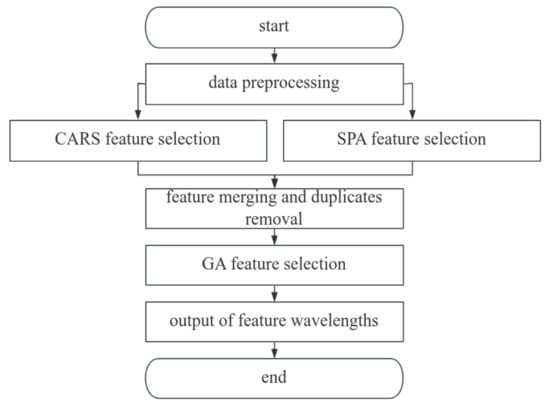Feature selection is a complex, large-scale problem, and GA is prone to converge prematurely when facing such problems, thus falling into local optimal solutions. Therefore, a CARS-SPA-GA feature selection method is proposed in this paper, as shown in Figure 4. Firstly, the preprocessed data are subjected to feature selection by the CARS and SPA algorithms. Then, the obtained two sets of feature wavelengths are combined and the duplicates are removed. Finally, GA is used for secondary feature selection, and the output feature wavelength is the final preferred feature wavelength.