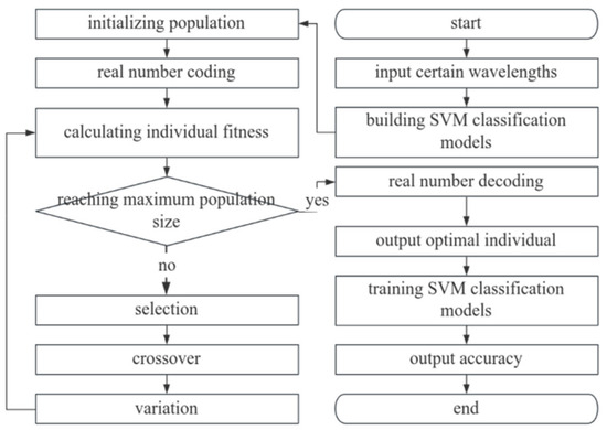 The experiment was based on the Python 3.7 programming environment, and the dataset was divided into a training set and test set according to a 7:3 ratio. The settings of the following parameters were decided based on research experience using the trial and error method and validated by the cross-validation method, using the classification accuracy as a decision criterion. In the wavelength selection algorithm, the number of GA population evolutions is 50, the population size is 90, the crossover probability is 0.8 and the mutation probability is 0.5. The maximum number of CARS iterations is 100, the maximum number of principal components is 20 and the number of cross-validations is 10. The maximum and minimum number of end elements of SPA are 20 and 5, respectively. In the RCGA parameter optimization algorithm, the maximum number of populations is 100, the number of population evolutions is 20, the crossover and variance rates are both 0.8 and the proportion of non-crossover parts is 0.5.