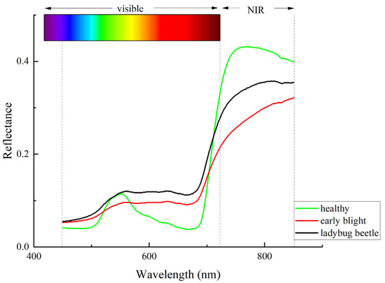 The spectral property of plant leaves is determined by their internal structure, chlorophyll, water, etc. [35]. The hyperspectral data of the three types of potato leaves were averaged over the full wavelength band and then visualized using the Origin software 2021 and divided into two regions, namely the visible and near-infrared regions. The average spectral curves of the three types of leaves are shown in Figure 6. Among them, due to the strong absorption of blue and red light by chlorophyll and the weak absorption of green light, the healthy potato leaves formed obvious absorption peaks near the blue light absorption band at 480 nm and the red light absorption band at 680 nm, as well as obvious reflection peaks near the green light region at 550 nm, which is in agreement with other scholars’ studies on the spectral characterization of potatoes [36]. The spectral curves of the three types of potato leaves are roughly similar: there is an obvious absorption peak at 680 nm, and the reflectance rises sharply at 680~750 nm due to the “red edge” effect, showing that the reflectance of the near-infrared region on the right side of the “red edge” is significantly higher than that of the visible region on the left side of the “red edge”. The reflectance of healthy leaves is lower than that of diseased and insect-infested leaves in the range of 450~580 nm, and there is an obvious reflectance peak at 550 nm in the curves of the healthy leaves, while those of the diseased and insect-infested leaves are more flat, probably due to the damage to these leaves and thus the decomposition of chlorophyll into carotenoids and lutein, which weakens the absorption of blue–violet light and has high reflectance. Chlorophyll is the main absorbing substance of red light. In the red light range of 580~720 nm, diseased leaves are damaged and the chlorophyll content decreases, which leads to a reduction in the absorption of red light by the leaves, resulting in higher reflectance than healthy leaves. In the red and near-infrared region to the right of 720 nm, the reflectance of diseased leaves is lower than that of healthy leaves, probably due to the damage to the cellular structure of the diseased leaves, which has an effect on the reflectance.