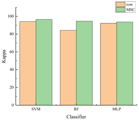 Appropriate preprocessing methods can reduce the interference of noise in the data and improve the classification accuracy. As can be concluded from the comparative experimental results in Table 1, the MSC preprocessing methods used in this experiment are able to eliminate the obvious noise in the spectrum. As can be seen from the visualization results in Figure 7, after preprocessing by the MSC method, the kappa of the data is substantially improved for the SVM and RF classifiers, and there is a small decrease for the MLP classifier. Hence, the subsequent experiments continued to use the MSC method to preprocess the data.