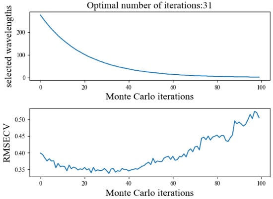CARS can effectively handle data redundancy and covariance. This algorithm combines the idea of importance sampling in Monte Carlo sampling with the regression coefficients of the partial least squares (PLS) model and uses the absolute value of the regression coefficients in the PLS model as the object of importance assessment [24]. First, the points with larger absolute values are taken as the new subset by ARS, and the points with smaller absolute values are eliminated; then, the PLS model is re-established based on the current subset, and the wavelength in the subset with the smallest RMSECV of the PLS model is the optimal feature wavelength after several iterations.