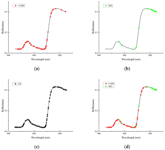 As shown in Figure 9d, when comparing the distributions of the two sets of feature wavelengths selected by CARS and SPA over the full band range, it can be found that there is almost no overlap between the selected features, and there is great variability.