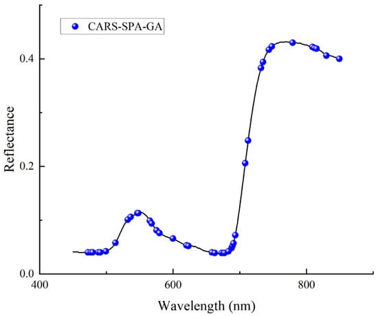 Based on the differences between the features selected by the two algorithms, CARS and SPA, in order to obtain more comprehensive and important features, the experiment combined the two groups of features and removed the duplicates. Then, they were processed to obtain 79 feature wavelengths, which were then subjected to secondary feature selection with the GA. Finally, 40 feature wavelengths were obtained, and their distributions are shown in Figure 10. CARS-SPA-GA selected a more uniform distribution of feature wavelengths in both the visible and near-infrared regions.