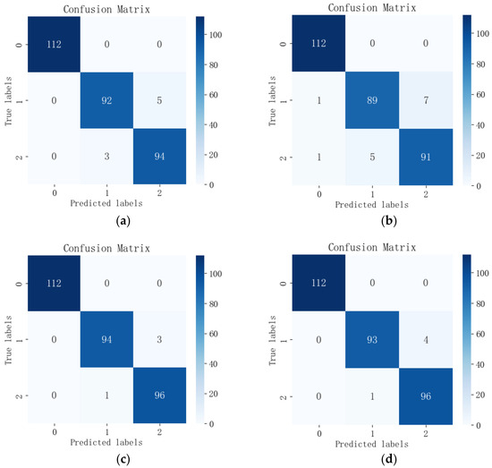 Confusion matrix of feature wavelengths selected by the four algorithms output in the RCGA-SVM model: (a) CARS; (b) SPA; (c) GA; (d) CARS-SPA-GA.