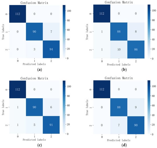 Confusion matrix of feature wavelengths selected by the four algorithms output in the RCGA-RF model: (a) CARS; (b) SPA; (c) GA; (d) CARS-SPA-GA.