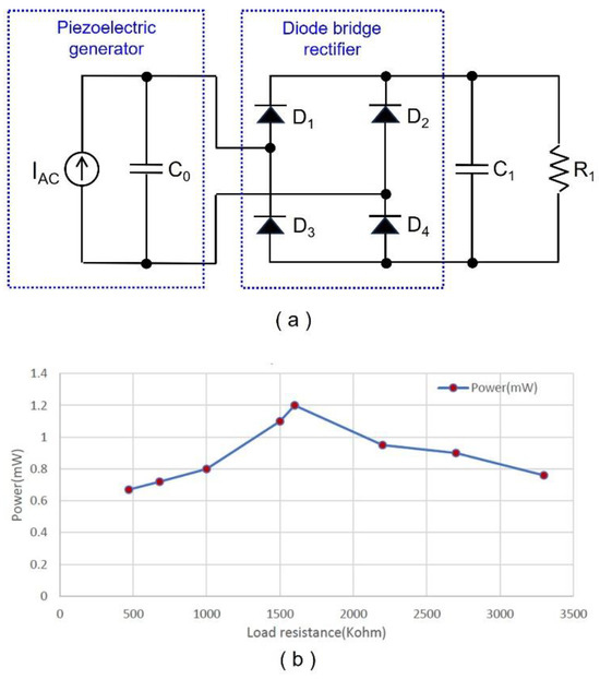 (a) Bridge rectifier and load resistance connected to the piezoelectric generator. (b) Output power vs. load resistance.